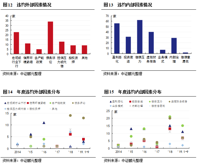 各年度的主要違約因素又有所不同。從外部因素來看,2014-2016年,宏觀或行業下行是違約的主要因素,但不是2017年-2019年9月違約事件的主要因素,取而代之的是債務訴訟帶來的賬戶或股權凍結、資產查封。宏觀或行業下行是產生盈利惡化的重要原因之一,而債務訴訟更多是償債壓力、盈利惡化這兩項內部因素的外在表現。2018年-2019年9月,由信用環境緊縮帶來的違約數量增加明顯,2018年還表現出股權質押平倉風險引發債券違約的特殊特征。從內部因素來看,2014年-2019年9月,償債壓力和盈利惡化一直是最主要的違約因素。投資激進和財務造假也是常見違約內部因素,但在2018年尤為凸顯,這可能與財務造假往往是營業惡化和巨大償債壓力下的“副產品”,而償債壓力大部分來源于激進投資的原因相關。