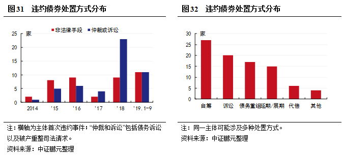 通常而言,主體違約后,一般首先以自主協商的方式進行后續處理,在無法獲得資金、與債務人達成償債協議時,才會采用司法途徑。但從實際經驗來看,根據違約實體的具體情況,違約債券的處置手段不同。