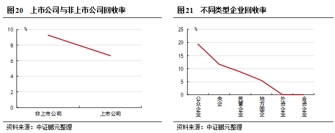 從企業性質來看,非上市公司與上市公司的回收率差別不明顯,非上市公司的9.26%回收率略高于上市公司的6.62%。公眾企業的回收率較好,為19.30%,民營企業8.73%的回收率略高于地方國有企業的5.53%。