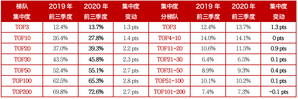 備注:操盤金額集中度=入榜房企操盤銷售金額/統計局公布的全國商品房銷售金額,其中,2020年前三季度全國商品房銷售金額是根據前8月累計同比增幅推算9月同比增幅所得。