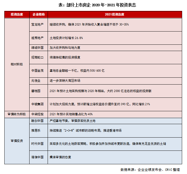 一季度末上市房企陸續(xù)公布了2020年成績單,業(yè)績會(huì)上部分房企透露了今年的銷售目標(biāo)和市場判斷,這無疑對(duì)未來企業(yè)投資策略產(chǎn)生巨大影響。整體而言,謹(jǐn)慎投資仍是主旋律,區(qū)域選擇仍聚焦長三角和粵港澳大灣區(qū),且在22城集中供地之下,普遍認(rèn)為提升投資質(zhì)量、拓寬投資渠道是突圍的核心競爭力。