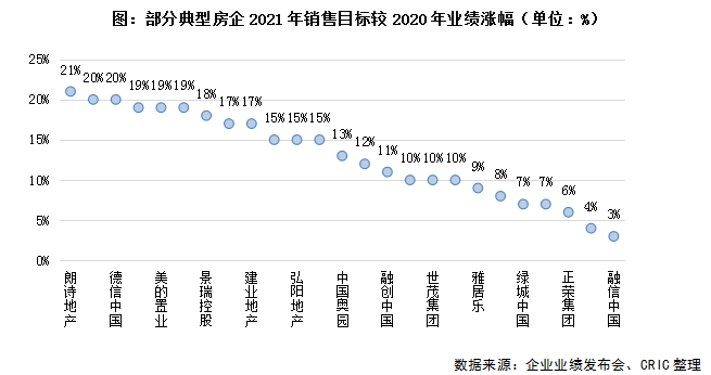 從近30家上市房企在業(yè)績發(fā)布會(huì)披露的2021年銷售目標(biāo)來看,整體目標(biāo)增幅有所放緩,近三成上市房企2021年的業(yè)績目標(biāo)預(yù)增低于10%,可以看出在杠桿紅利消失后,企業(yè)發(fā)展以穩(wěn)健、提質(zhì)增效為主。