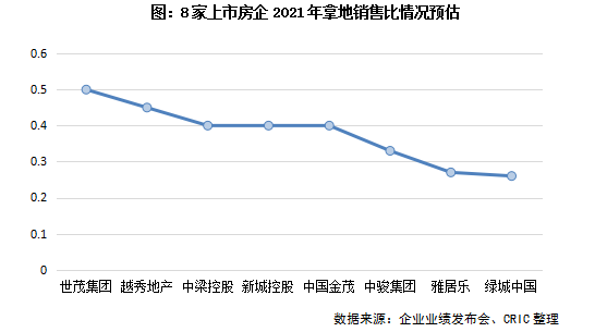 從部分公布了2021年投資預(yù)算的房企來看,不同房企的拿地銷售比有較大的差異:世茂、中梁等房企提出將按銷售的50%和40%比例來控制拿地,而金茂的預(yù)期的全口徑投資金額為千億左右,整體拿地銷售比達(dá)到0.4。